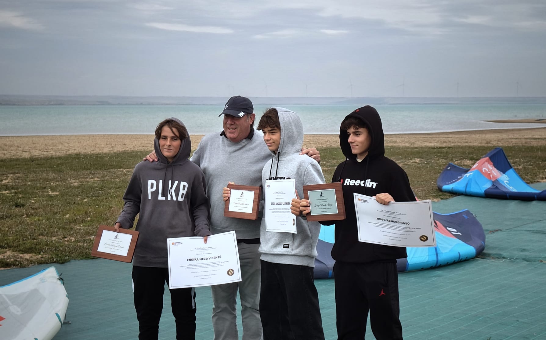 Hoy se han reconocido el trabajo y resultados de los tres jovencísimos deportistas de la Federación Aragonesa de Vela, pertenecientes al CKLL, Oskar Argudo, Endika Mezo y Hugo Renedo. En el acto han estado la directora general de Deporte del Gobierno aragonés, Cristina García; el presidente de la Federación Aragonesa de Vela, Miguel Sánchez; el responsable del campeonato del mundo GK Global Kiteboarding Association, Álvaro Onieva; y varios directivos del Club Kitesurf La Loteta.
